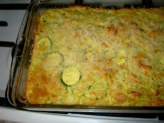 3. In a large bowl whisk together the eggs, oil, Romano cheese, parsley, salts, oregano and garlic powder. Whisk in the onion, and then the Bisquick. With a rubber spatula, gently stir in the sliced zucchini, being careful not to break up the slices. Turn the mixture into the pan and smooth the top.